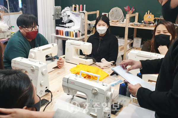 이날 전달한 마스크는 홍성군에서 추진하는 청년있슈(ISSUE)마을 운영 프로그램에 참여 중인 홍성 정착 청년들이 퇴근 후 틈틈이 배운 재봉틀로 만든 필터교체형 면 마스크 200장이다.