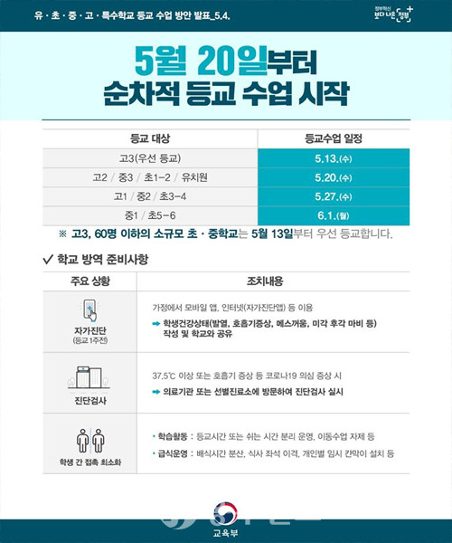 다만 고등학교 3학년은 황금연휴로부터 일주일 뒤인 13일부터 먼저 등교한다. 고등학교 3학년은 학기 초에 이뤄졌어야 할 진로·진학 상담이 너무 늦어졌고, 대입 수시모집용 1학기 학교생활기록부를 빨리 채워야 하는 등의 이유 때문이다. 교육부는 “교원·학부모 대상 설문조사에서 고3이 우선 등교하는 방안에 교원의 76.9%, 학부모의 85.0%가 찬성한다고 답했다”고 설명했다. 나머지 학년은 20일부터 순차적으로 등교 수업을 시작하기로 했다. 중·고등학교는 고학년부터, 초등학교는 저학년부터 등교를 시작한다. 오는 20일에 고등학교 2학년과 중학교 3학년, 초등학교 1∼2학년이 등교하고, 27일에는 고등학교 1학년과 중학교 2학년, 초등학교 3∼4학년이 등교한다. 마지막으로 6월 1일에 중학교 1학년과 초등학교 5∼6학년이 등교한다.