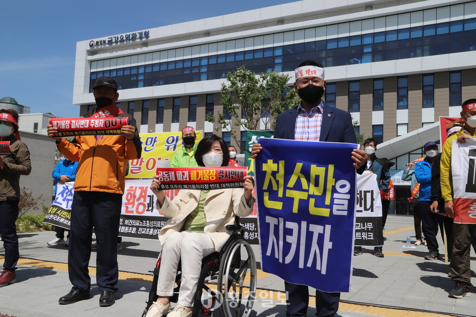 대책위와 주민들은 KC환경개발이 주민 동의 없이 추진하고 있는 산업폐기물처리장이 업체의 뜻대로 들어설 경우 “국가 수자원보호구역인 천수만 수계의 환경파괴는 명약관화한 일”이며 “만일 사고가 발생해 침출수 발생 및 지하수가 오염된다면 농‧어업이 주인 인근의 절대다수 지역민들의 생존에 지대한 악영향을 받을 것”이기에 “해당 사업의 승인권을 가진 홍성군의 사업 불허는 물론 업체가 제출한 환경영향평가서를 금강유역환경청이 ‘부동의’해 줄 것을 믿으며, 마땅히 그래야 한다”고 촉구했다.