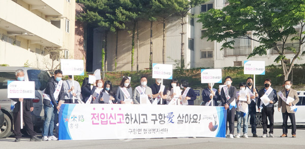 구항면(면장 조성각)은 지난 12일 군 안전총괄과 직원들과 함께 온누리아파트와 마온아파트 일원에서 10만 인구 회복을 위한 주민등록 전입독려 캠페인을 실시했다.<사진> 이날 캠페인에서는 공동주택 실 거주자 중 미 전입세대를 대상으로 전입 안내문과 각종 인구증가 시책을 홍보하는 전단을 배부하고 ‘내 고장 내 주소 갖기운동’에 적극 동참해줄 것을 독려했다.