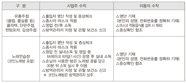 클럽·룸살롱 등 유흥주점과 콜라텍, 단란주점, 헌팅포차, 감성주점 운영자는 출입자 명단 작성과 증상 체크, 종사자 마스크 착용, 영업 전·후 소독, 방역 관리자 지정 및 관할 보건소 신고 등의 조치를 취해야 한다.