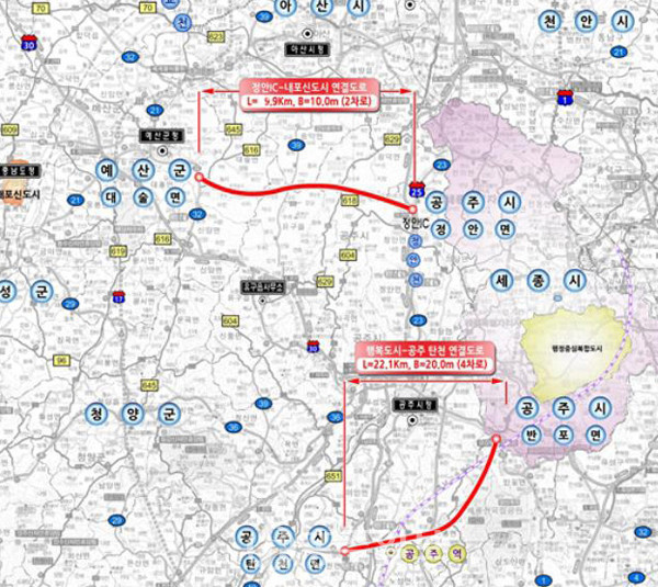 KTX공주역과 세종시, 충남도청내포신도시와 세종시를 잇는 광역도로가 새롭게 건설된다.