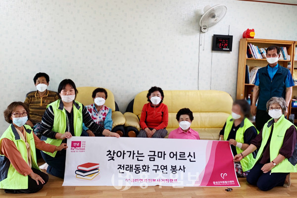 금마면(면장 한광윤)과 금마면자원봉사거점캠프가 함께하는 ‘찾아가는 금마 어르신 전래동화 구연봉사’가 지난 8일 당곡 마을회관에서 진행됐다.<사진>