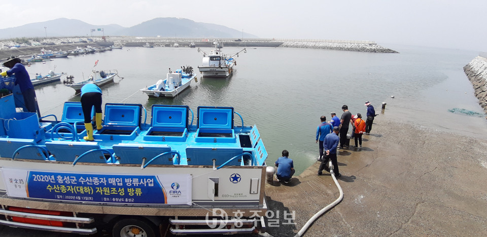 지난 13일 홍성군은 수산자원조성을 통한 지역 어업인들의 소득증대와 수산자원 증강을 위한 방류사업을 실시했다.<사진> 이날 어업인 대표자들이 참여한 가운데 청정해역인 홍성군 천수만 지역특성에 적합한 전장 1.2cm크기의 우량 대하종묘 2900만 마리를 방류했으며, 코로나19 예방을 위해 관련행사는 생략했다.