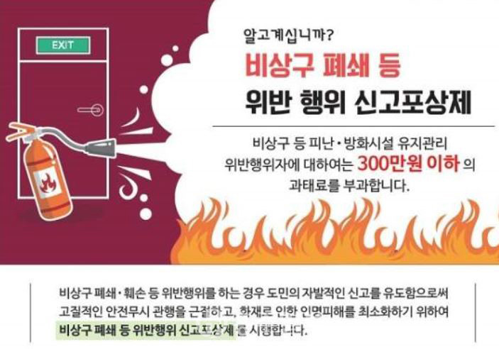 송원석 예방교육팀장은 “비상구를 훼손하거나 사용을 못 하게 하는 것은 단순히 과태료가 부과되는 위법행위가 아니라 이웃과 자신의 생명을 위협할 수 있는 위험한 행위다”라며 “긴급사항 발생 대비를 위해 비상구는 반드시 확보해야 한다”라고 강조했다.