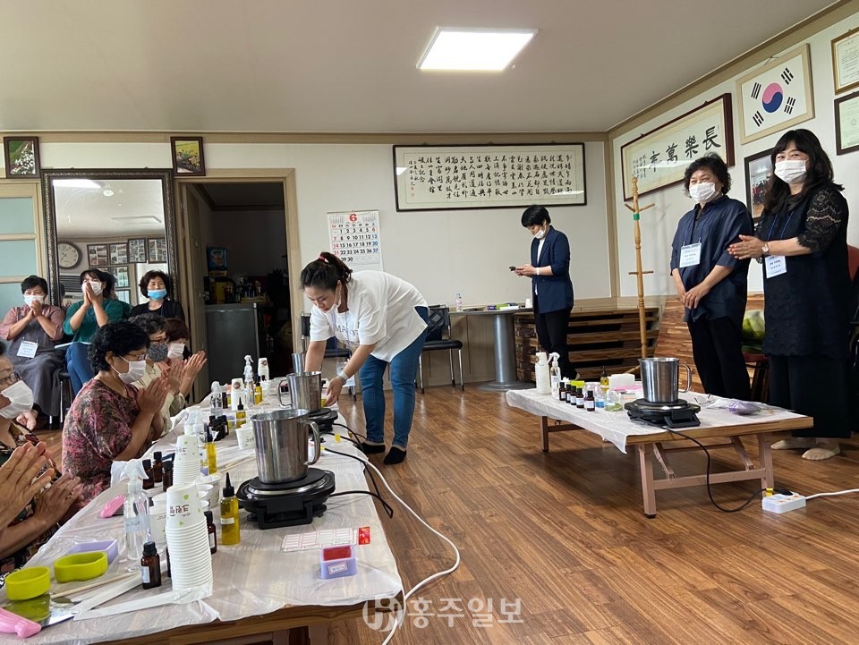 이날 △결성면 원천마을 △홍동면 반교마을·학계마을 △갈산면 동산마을 △장곡면 고미당마을 △서부면 소도마을 △금마면 와야마을 등 관내 마을별 천연비누제작법강의 이수자들이 주강사 1명, 보조강사 1~2명으로 팀을 이뤄 주민들을 대상으로 페퍼민트, 라벤더 등 허브 오일을 이용한 천연비누 제작 강의를 했다. 강의 후에는 수업이 어땠는지 서로 의견을 나누는 시간을 가졌다.