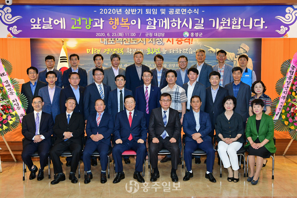 지난 23일 홍성군은 오랜 기간 군민의 복리증진과 군정발전을 위해 헌신한 10명의 공직자들의 은퇴와 공로연수를 축하하고 인생 제2막을 응원하는 '2020년 상반기 퇴임 및 공로연수식'을 개최했다.<사진>