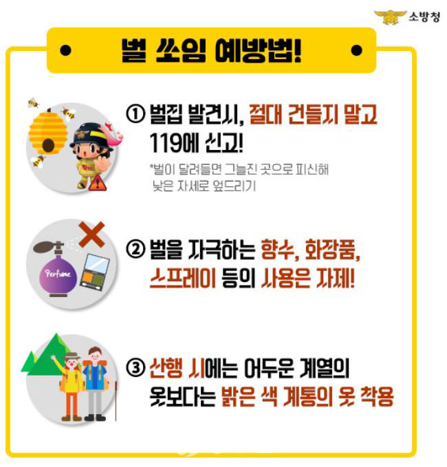임응순 119구조구급센터장은 “6월에서 8월에는 벌의 활동이 왕성해지므로 벌집을 발견한 경우 무리한 행동을 삼가고 119에 신고해야 한다”라고 전했다.