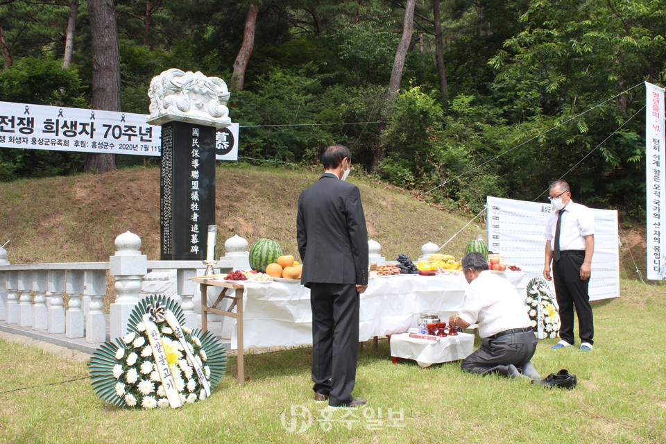 지난 11일 홍성군과 (사)한국전쟁민간인희생자 홍성군유족회(회장 이종민)는 용봉산 입구에 위치한 한국전쟁민간인희생자 추모공원에서 한국전쟁민간인희생자 70주년 추모제·추모식을 열었다. 이날 추모식은 추모공연을 시작으로 유교식 추모제례를 올리고, 이어 추모식을 진행했다.