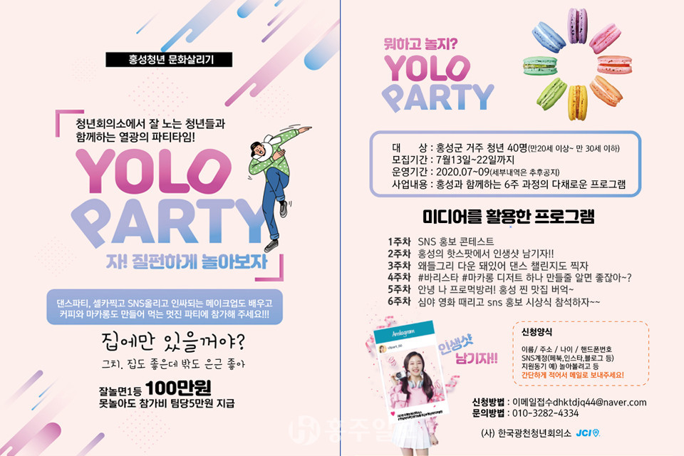 욜로 파티는 1주차 SNS홍보 콘테스트를 시작으로 홍성의 핫스팟에서 인생샷 남기기, 댄스 챌린지, 마카롱 만들기, 홍성 맛집탐방 등으로 구성된 다채로운 프로그램으로 6주에 걸쳐 실시될 예정이다.