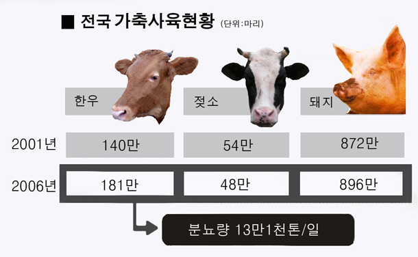 가축들이 내놓는 분뇨는 하루 13만1천t에 이른다. 돼지 사육두수가 많기 때문에 10t트럭 1만 3천대가 수거해야 하는 양이다. 이는 양 자체가 어마어마할 뿐 아니라 일반 폐기물과 달리 고체와 액체가 섞여 있는 데다 유기물이 발효되기 때문에 냄새가 나고 저장에 한계가 따르는 맹점을 갖고 있다.