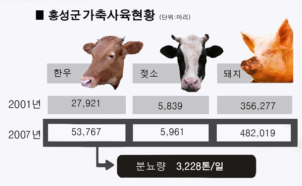 홍성군의 가축분뇨 역시 적은량이 아니다. 한우, 돼지, 젖소 등 51만4,386마리에서 배출되는 1일 분뇨가 3,228톤에 이르는 것으로 나타났다.