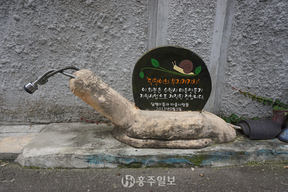 특히 낡은 단독주택과 빌라가 많은 골목길에서 ‘삼보맨션 사람들’과 ‘대경빌라 사람들’이란 글귀가 눈길을 끈다. 빗물을 빼주는 달팽이 모양의 우수관(雨水管)은 마치 동네 이름을 말해주고 있는 듯하다.