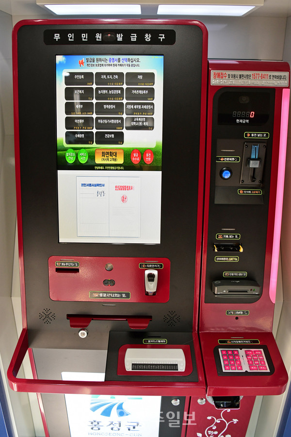또한 음성안내, 점자 키패드, 휠체어 경사로 출입구와 자동문 설치 등 사회적 약자를 배려한 편의 기능이 추가됐다. 이로써 군에 설치된 24시 무인민원발급기는 홍성군청과 홍성읍 행정복지센터에 총 2대로, 앞으로 발급기 설치를 늘릴 계획이라고 전했다.