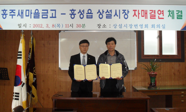 홍성군은 지난 8일 오전 11시 30분 홍성군 상설시장 번영회 사무실에서 홍주새마을금고(이사장 오세승·사진 좌)와 홍성군 상설시장(번영회장 송기준·사진 우) 간에 전통시장 지원 자매결연 협약을 체결했다.