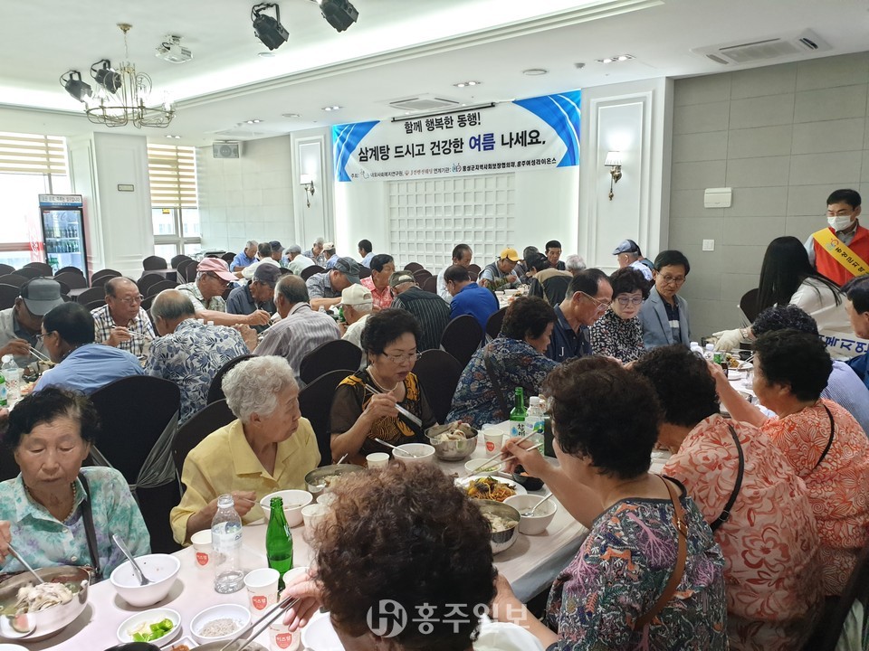 30일 12시에 내포사회복지연구원(원장 정윤)은 j컨벤션웨딩홀에서 지역 내 어르신들의 건강한 여름나기를 위한 삼계탕 나눔 행사를 열었다.