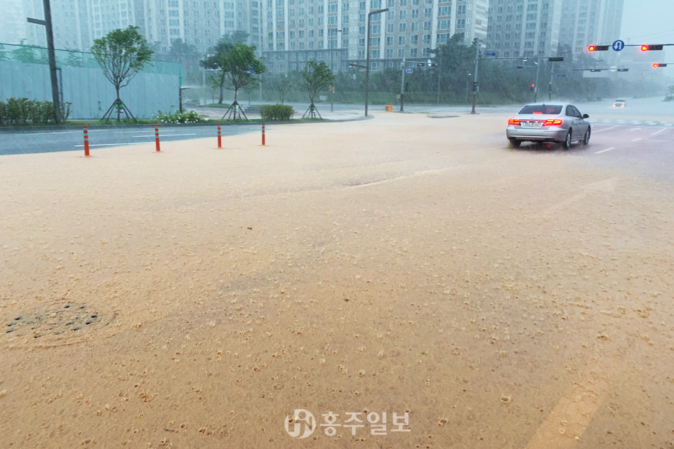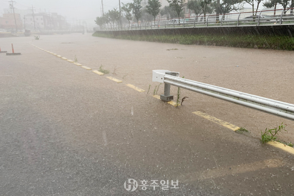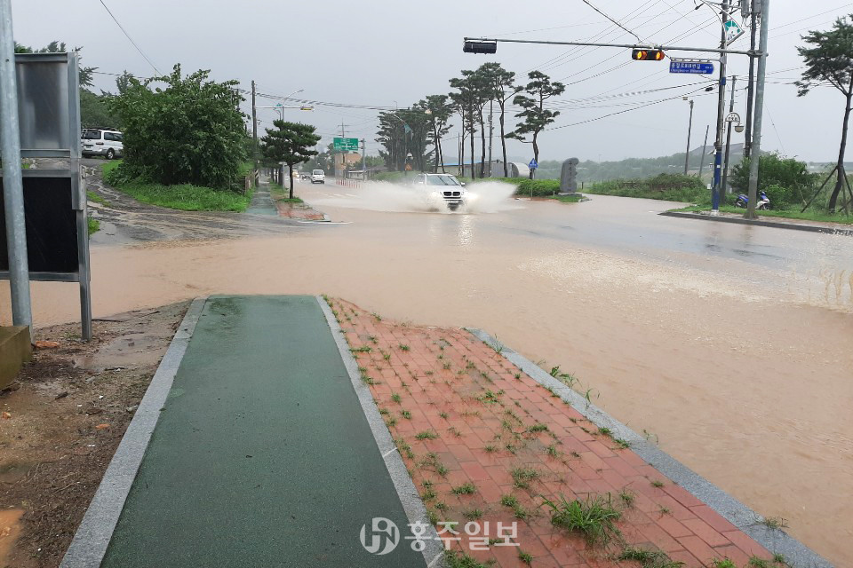 홍성읍과 내포신도시를 연결한 도청대로의 구 홍성여고 사거리부터 덕산통사거리 구간 양방향 도로를 따라 물줄기가 넘쳐흘러 차량 통행에 지장이 있었으며, 홍성역과 역재방죽 앞 역재교차로 구간 도로(조양로246번길)도 고지대에서 흘러내린 토사가 도로를 덮었다.