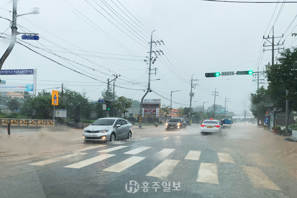 기상청에 따르면 서울·인천·경기 등 수도권을 비롯해 경북·충남·충북·강원 일부 지역에는 이날 호우경보가 발효 중이며 그 밖의 지역에는 호우주의보가 내려져 있다. 오전 10시 기준 경기와 강원지역에는 시간당 50㎜의 강한 비가 쏟아지고 있고, 중부지방에는 돌풍과 천둥·번개를 동반한 시간당 최고 100㎜의 폭우가 예보된 상태에서 홍성 역시 폭우로 인한 피해가 속출했다.
