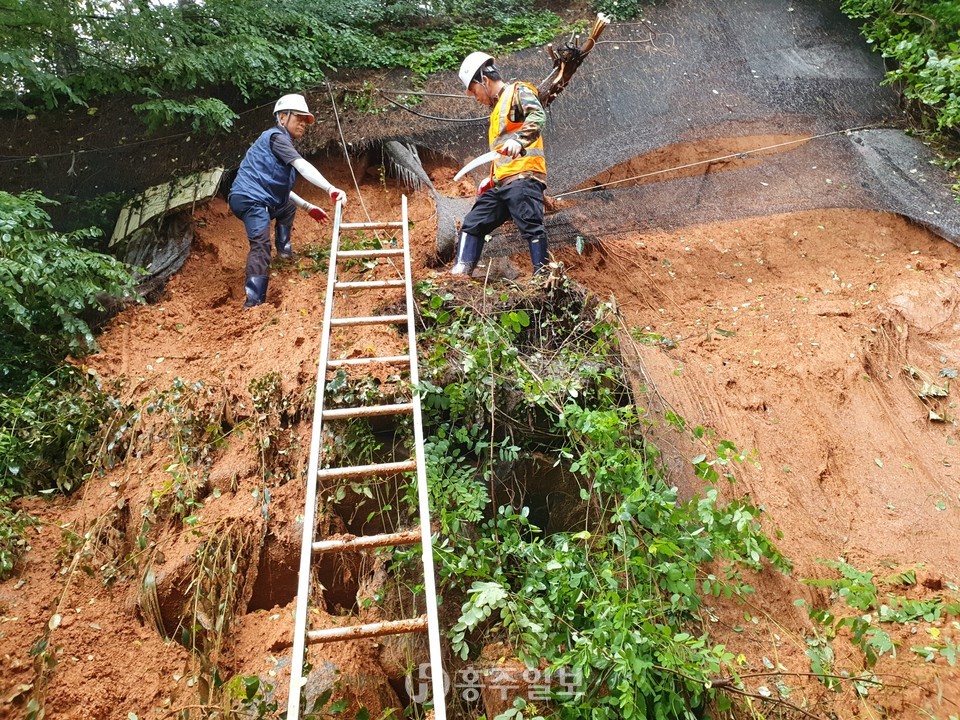 홍성군 산림재해 스피드 봉사대(대장 김광억)가 연일 계속되는 장마철 호우피해지역에 신속한 응급복구를 실시하고 있다.