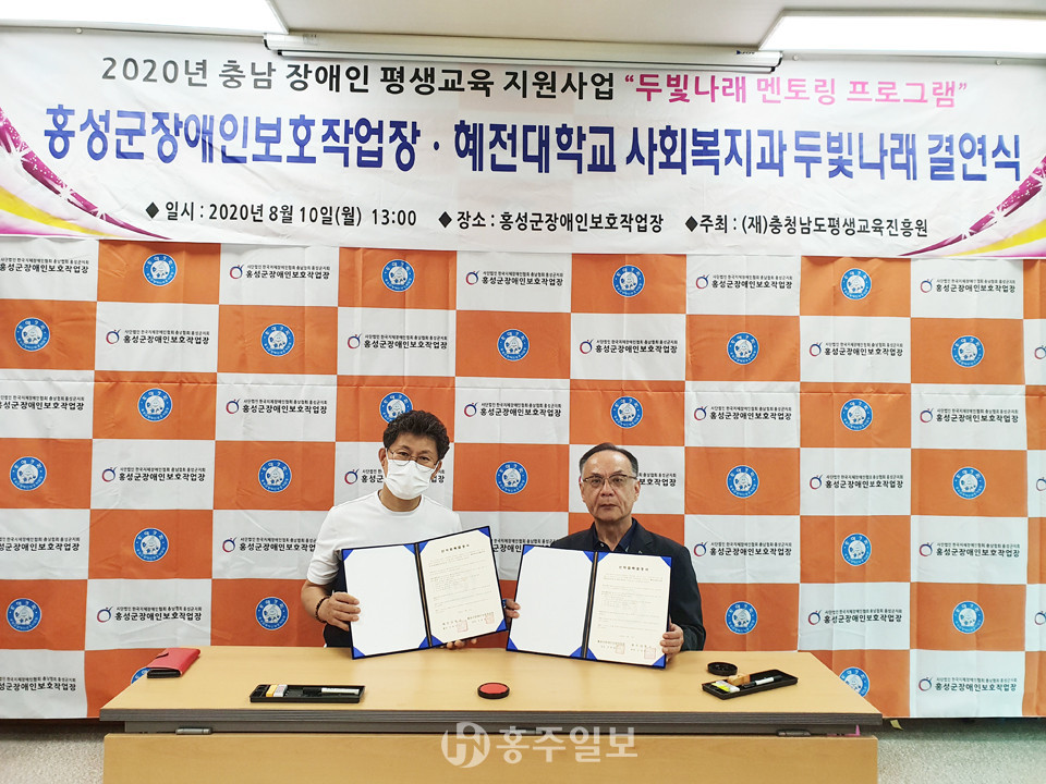 홍성군장애인보호작업장(원장 김호현)과 혜전대학교 사회복지학과(총장 이세진)가 지난 10일 ‘두빛나래’ 사업을 위한 결연을 맺었다.<사진>
