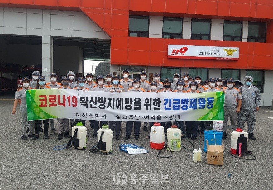 예산소방서 삽교읍남·여의용소방대(대장 강봉수, 김한순)가 코로나19 확산을 방지하기 위해 지난 22일 긴급 방역활동에 나섰다.