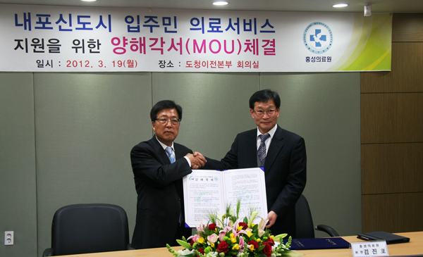 충남도 도청이전·내포신도시건설본부(본부장 이종기<사진 왼쪽>·이하 도청이전본부)는 내포신도시 입주민에 대한 양질의 의료서비스 제공을 위해 지난 19일 홍성의료원(원장 김진호·사진 오른쪽)과 양해각서(MOU)를 체결했다.