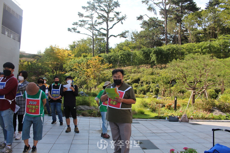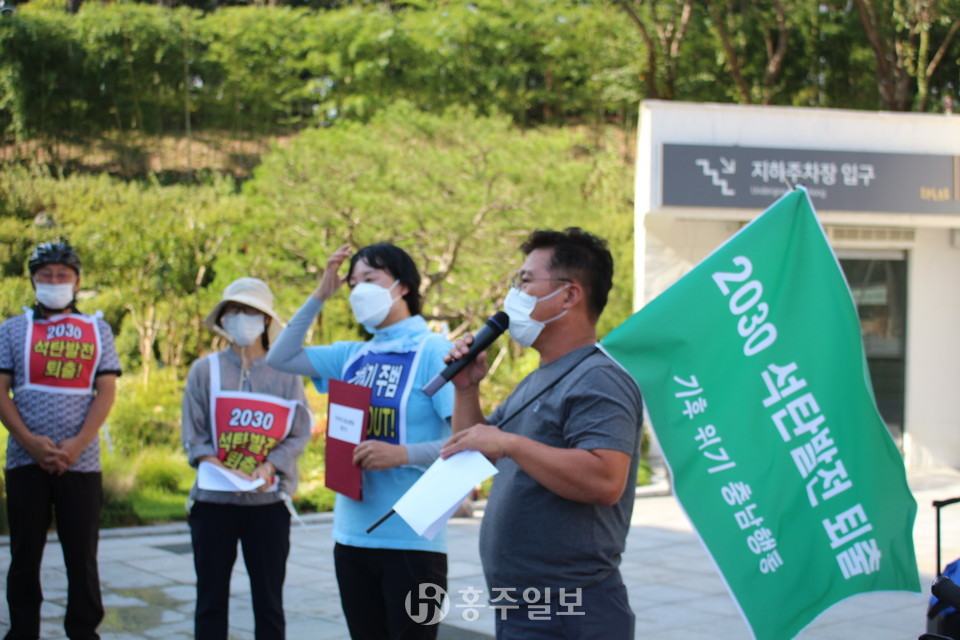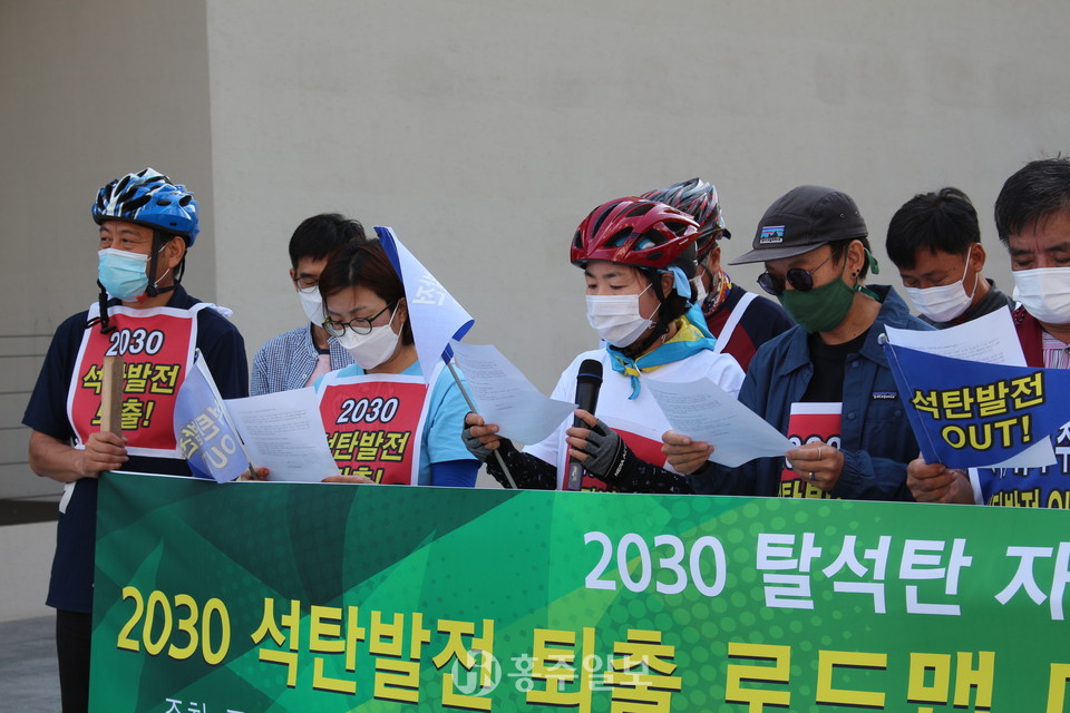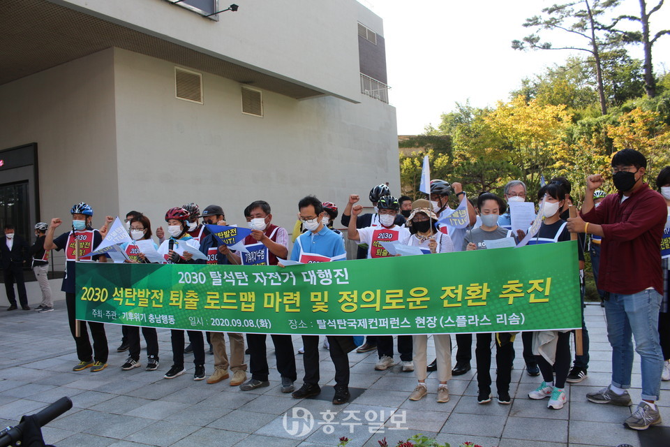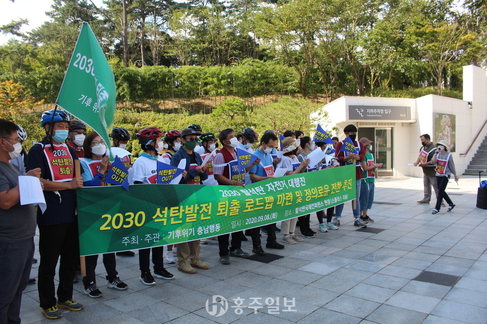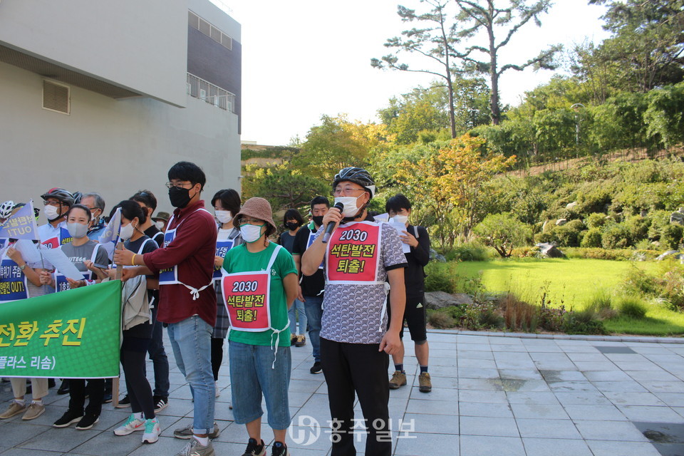 예산홍성환경운동연합(공동의장 고광성, 조성미)은 지난 8일 충남도청에서 ‘탈석탄 자전거·도보 행진’을 진행하고 목적지인 예산군(군수 황선봉) 덕산면에 위치한 리솜 스플라스에서 기자회견을 했다.