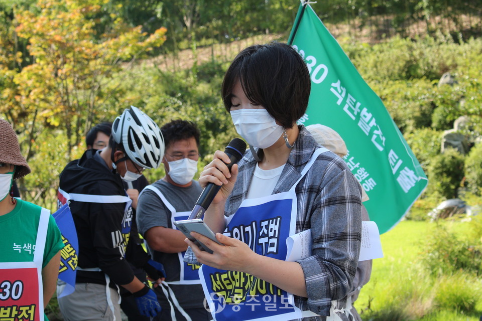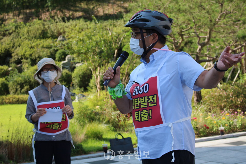 충남환경운동연합 탈석탄특별위원회 최효진 위원장은 경과보고를 통해 “경기·충남·인천 등의 지역 환경운동연합들이 모여 ‘공동행동주간’을 지정하고 청와대 등지에서 기자회견을 할 예정이었으나 코로나19 팬데믹으로 인해 모두 취소되고 오늘의 이 자전거·도보 행진만이 유일하게 추진하게 된 행사다”라며 “그럼에도 우리의 뜻이 잘 전달됐으면 한다”고 밝혔다.