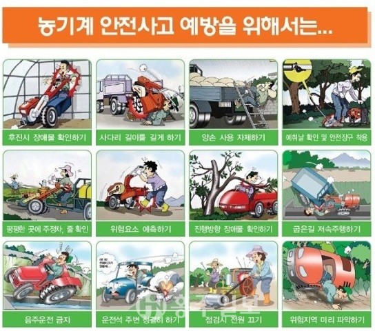 이러한 농기계 사고를 예방하려면 △농기계 사용전·후 점검하기 △점검중 엔진 끄기 △안전장구 착용하기 △도로주행 시 교통법규 준수하기 △음주운전 금지 등 안전수칙을 준수해야한다.