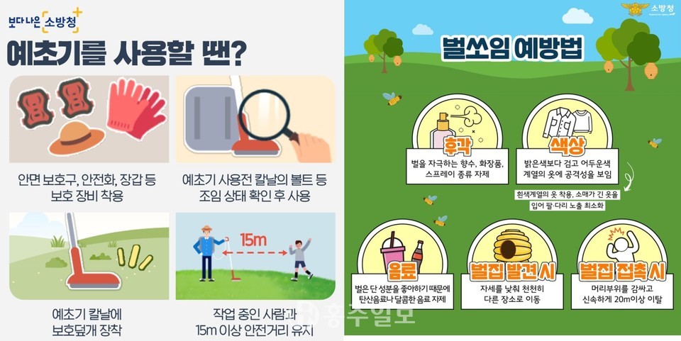 또한 소방서는 예초기 사용이 급증하고 있다며 안전사고 예방을 위해 안면보호구와 안전화 등 각종 보호 장비를 철저하게 착용해야함은 물론 진드기 등 해충 피해를 방지하기 위해 긴 옷을 착용하고 귀가 후 빠른 옷 세탁과 샤워를 해야 한다고 전했다.