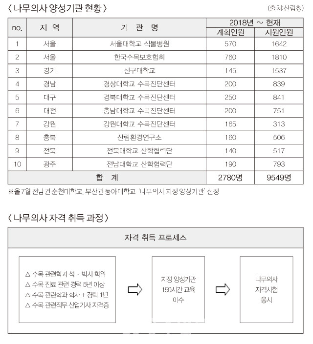 현재 나무의사 자격시험은 양성기관에서 150시간의 교육을 이수해야만 시험에 응시할 수 있는 자격이 부여된다. 자격시험이 시행된 지난 2018년 이후 교육선발인원의 3배가 넘는 인원이 지원했지만 정원 부족으로 2780명밖에 교육받지 못하며 높은 수요에도 양성기관 공급이 부족한 상황이다.