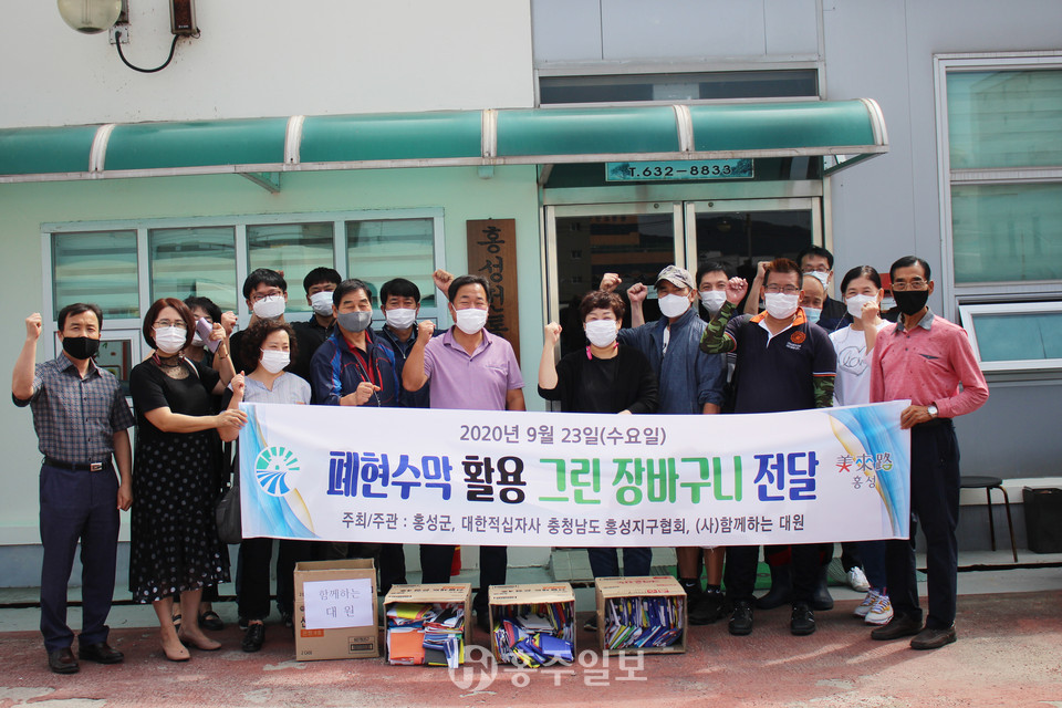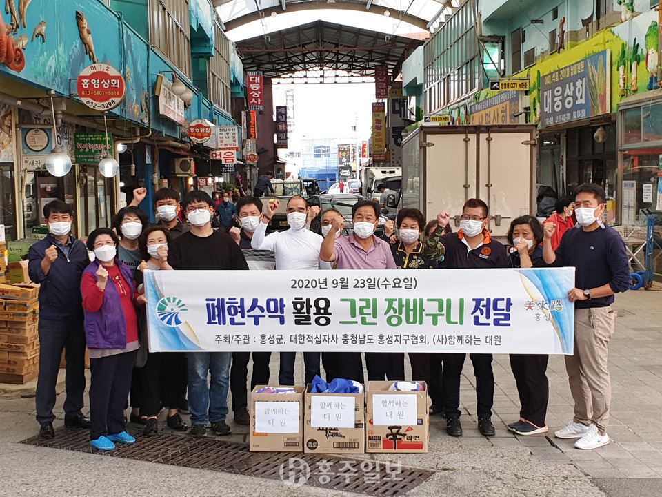 홍성군은 지난 23일 추석 명절을 앞두고 홍성상설시장과 전통시장을 방문해 폐현수막을 새활용(업사이클)해 제작한 ‘그린 장바구니’ 700장을 전달했다.