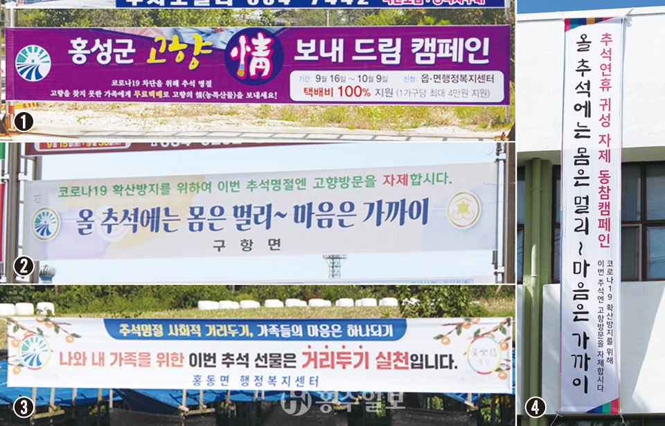 추석 연휴를 통해 전국으로 확산될 위험을 최소화하기 위해 전국적으로 고향 방문 자제 캠페인을 벌이고 있다. 홍성군도 고향을 찾지 못하는 가족에게 고향의 정(농·특산물)을 보낼 수 있게 택배비를 지원해주는 ‘고향 정 보내 드림’ 캠페인을 진행 중이다. 각 읍·면 소재지와 마을입구 등에 ‘올 추석에는 몸은 멀리~ 마음은 가까이’, ‘코로나를 이기는 가장 좋은 백신은 고향방문 자제입니다’ 등의 추석 명절 민족 대이동을 자제하는 문구가 적힌 현수막을 내걸어 모든 지역주민들 함께 노력하자는 뜻을 담았다.