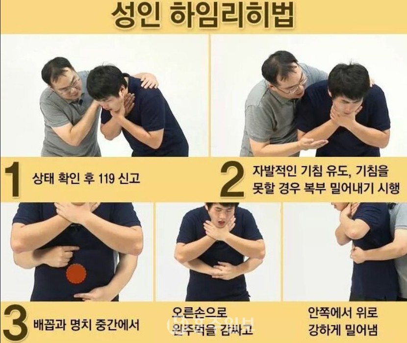 하임리히법은 △먼저 환자의 상태 확인 후 119신고 △자발적인 기침을 유도 △배꼽과 명치 중간사이에 주먹 쥔 손을 다른 손으로 감싸 위치시킨 후 안쪽에서 위로 강하게 당기기의 과정을 119 도착 시까지 반복하는 식으로 진행하면 된다.