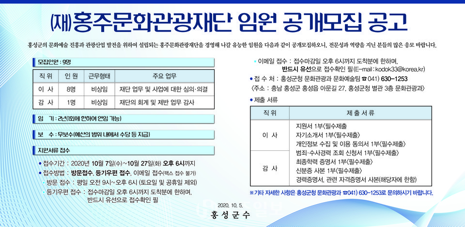 홍주문화관광재단 임원 공개모집에 관해 보다 자세한 사항은 홍성군청 문화관광과(041-630-1253)으로 문의 가능하다.
