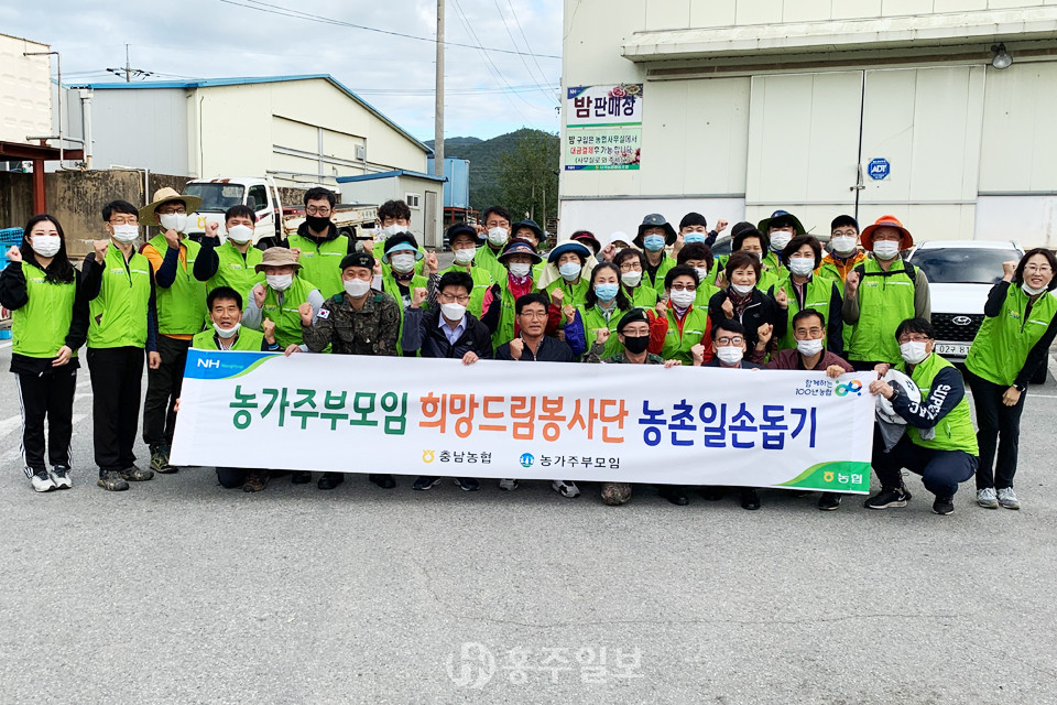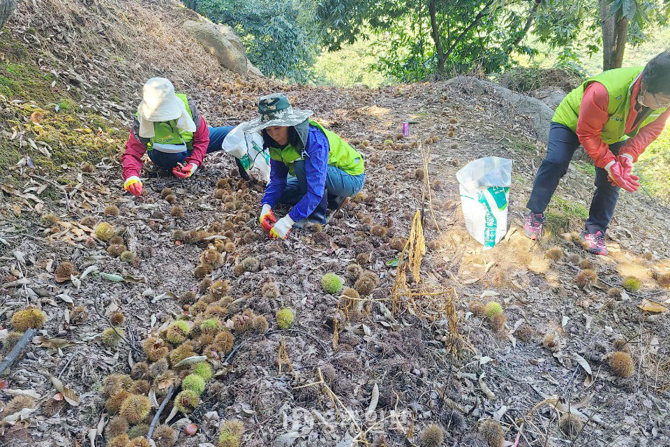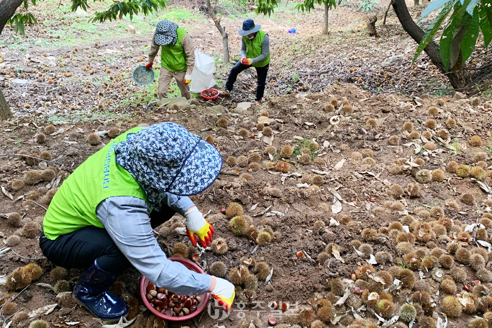 농협 충남본부와 육군 32사단 장병 및 농가주부모임 충남도연합회(회장 김부옥) 회원 등 100여명은 농업인들에게 힘이 되고자 밤 수확 현장 지원에 나섰다. 고향주부모임 충남도지회(회장 임춘숙)는 일손지원에 나선 봉사단의 중식을 지원해 지역민이 함께 하는 뜻깊은 농촌봉사활동이 됐다.