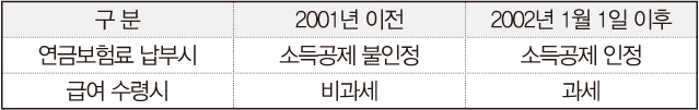 ❍ 국민연금은 2002년 이후 부과된 보험료에 대해 소득공제를 받을 수 있게 됐습니다. 이에 따라 2002년 1월 1일 이후 가입기간에 의해 산정된 노령연금·반환일시금을 과세대상에 포함하고 있습니다. 다만 장애연금과 유족연금은 과세대상에 포함하지 않습니다.