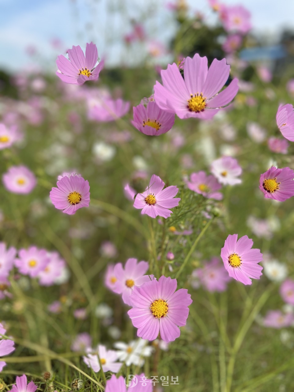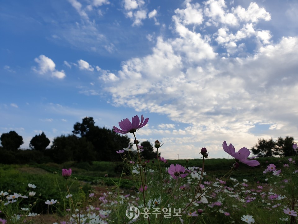 기사제목에 인용한 구절은 윤동주 시인이 1938년 9월 20일에 쓴 시 ‘코스모스’의 한 구절이다. 홍북읍 석택리에 지난 8일 ‘찬이슬이 맺히기 시작하는 절기’인 한로 이후부터 코스모스가 만개했다. 코스모스는 대표적인 한해살이 가을 꽃 중 하나로, 그 이름은 ‘질서정연함’, ‘우주’를 의미한다. 이미 전국 각처에서 흔히 볼 수 있는 꽃이지만 본래는 멕시코 원산인 신귀화식물이다. 야생 코스모스는 해에 따라 크게 군락을 이루기도 하고, 아예 사라져버리기도 한다. 이를 ‘해거리’라고 일컫는다. 이는 코스모스가 추위에 약한 ‘반내동성식물’이라 기온이 낮을 시 토양 속에 있는 종자들이 모두 동사해 버리는 것이라고 한다.