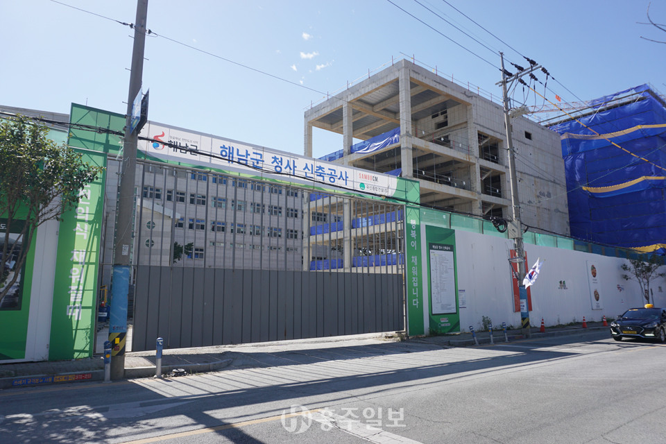 해남군 새 청사 건립공사는 지난 2019년 6월 10일 착수했으며 8월 터파기공사로 본격 착공했다. 휴일 공사에 따른 주민불편을 최소화하고자 일요일은 공사장을 휴무키로 했으며, 여기에 계속된 장마와 코로나19로 인한 변수가 발생하면서 공사기간이 지연됐다. 따라서 당초 용역결과 책정된 공사기간 20개월 보다 5개월여 늘어난 공사기간을 확대해 추진 중이다.