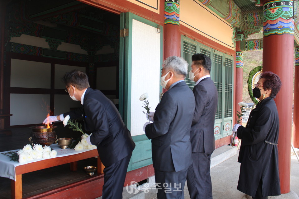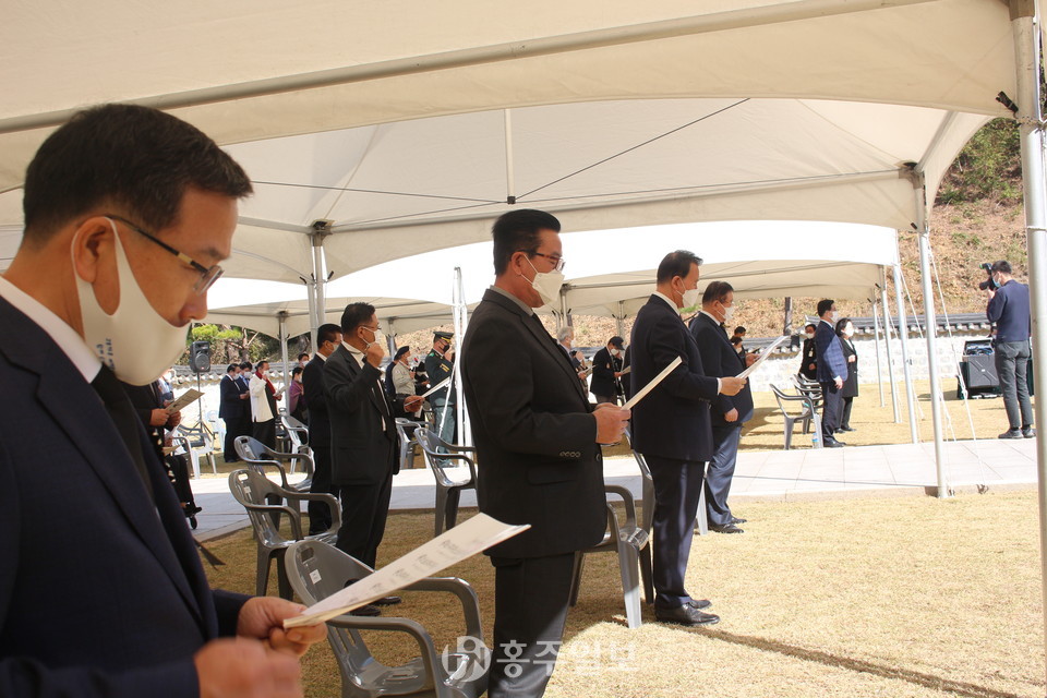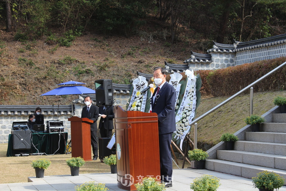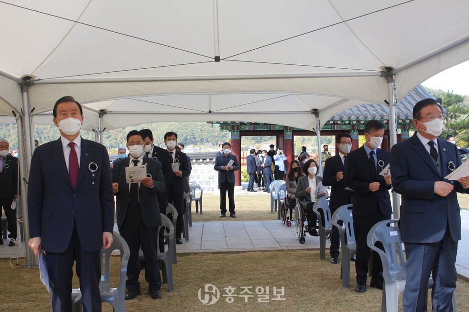 이어 국민의례와 호국영령들에 대한 묵념 후 김석환 군수가 추념사를 통해 “오늘 우리는 김좌진 장군의 숭고한 애국정신을 기리고 정신적 무장을 해나갈 것이다”고 존경의 뜻을 보였고, 양승조 도지사는 추모사를 통해 “조국독립을 위해 헌신하신 김좌진 장군과 애국선열들을 향해 머리 숙여 명복을 빈다. 역사의 순간에서 조국을 위해 본인의 희생을 두려워하지 않음이 후손들을 더 나은 세상에 서게 했다”며 백야 김좌진 장군의 강직한 정신을 기렸다.