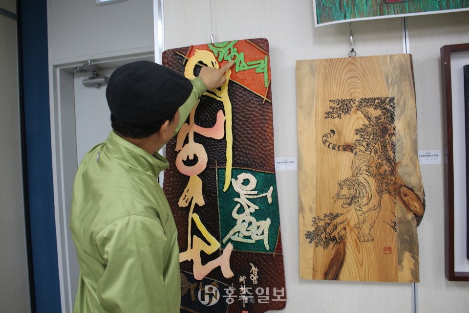 “우리 회원들은 원래 홍성도서관 지하 공예실에서 작업을 해왔는데, 코로나19로 인해 도서관이 폐쇄가 되면서 대교공원에 있는 쉼터 공간으로 자리를 옮겨 작품활동을 이어갔어요. 이번 전시회는 그런 과정을 거쳐가며 만들어낸 작품들이 모여있습니다. 서각의 밑그림을 ‘서고’라고 말하는데, 우리 지역에서는 이 서고부터 완성작까지 우수한 작품들이 많아요.”