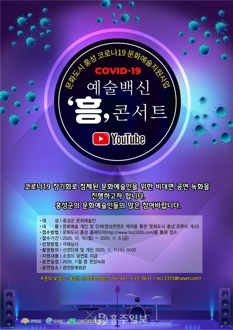홍성군 문화특화지역조성사업 추진사업단(단장 이승우)은 코로나19로 침체된 공연예술을 활성화하고 주민들의 문화 향유 기회를 늘리기 위해 11월 중 ‘예술백신 흥 콘서트’를 개최한다.