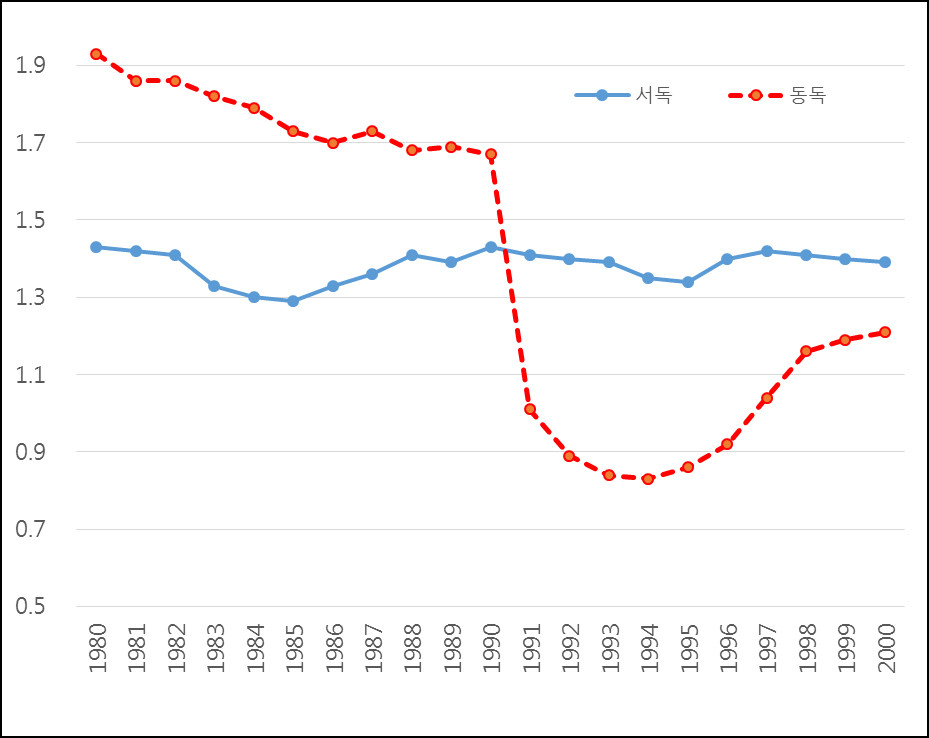 독일은 1990년 10월 3일 통일 후 출산율에 급격한 변화를 보인다. 1990년 통일 전 서독의 출산율은 1.43명, 동독은 1.67명으로 동독의 출산율이 높았다. 통일이 되자 서독 지역의 출산율에는 변화가 없었으나 동독지역은 출산율이 크게 하락한다. 통일 후 1년이 지난 1991년에는 1.01명, 1992년에는 0.89명, 1994년에는 0.83명으로 하락한다. 통일 전에 비하여 4년 만에 절반으로 감소한 것이다.