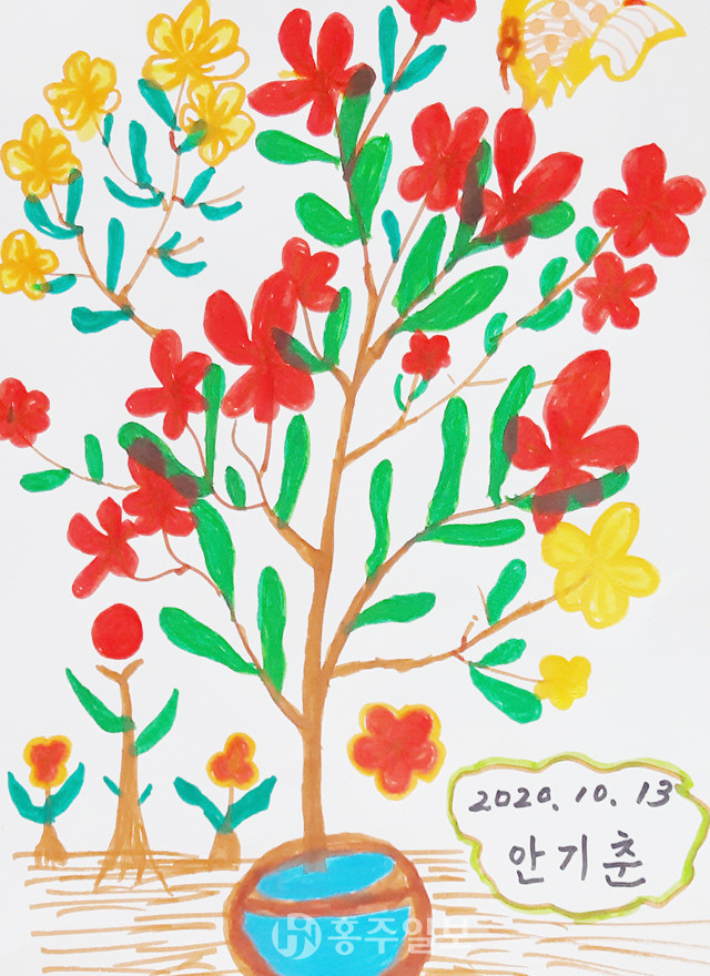 안기춘 할머니가 그림을 그려오셨습니다. ‘잘 그릴 수 있을지 한 번 그려 본 거’라고 하셨습니다. ‘충분히 잘 하실 수 있다.’ 고 말씀드리니 ‘그래요?’ 하고 좋아하십니다. 화분에 심은 꽃나무를 그리셨는데 나뭇가지가 뻗은 모양이나 꽃모양이 시원시원 하였습니다. 안기춘 할머니 머리에는 나비도 한 마리 앉아 있었습니다. 하얀 머리카락 위에서 반짝반짝 빛나고 있었습니다.