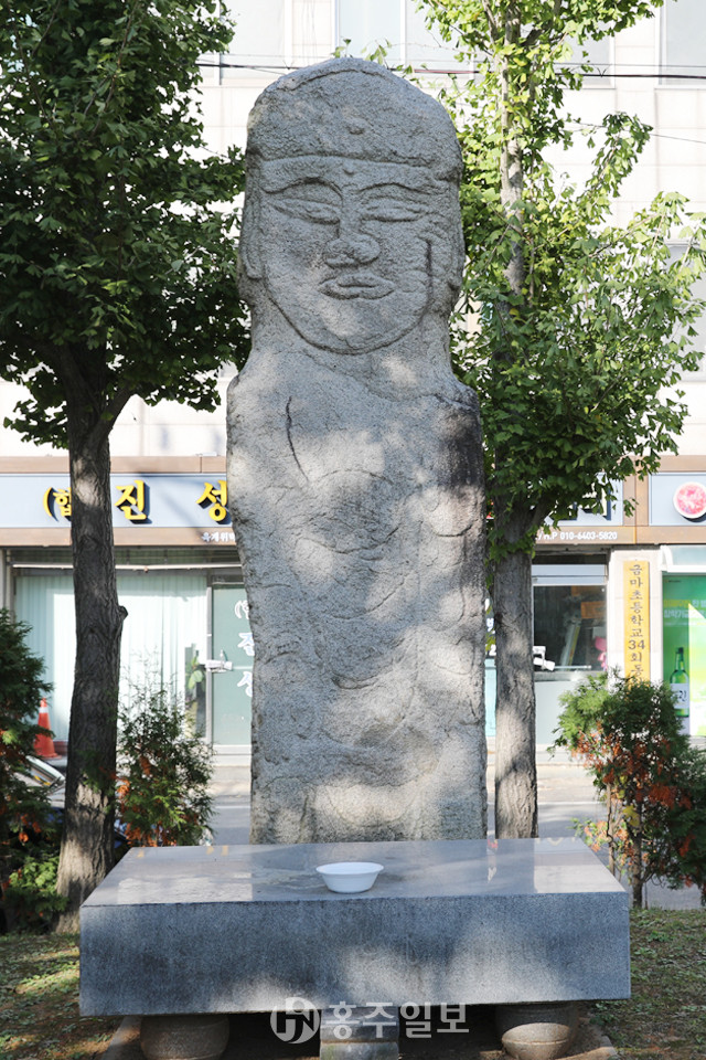 원래 야산이었을 이곳은 밭으로 변했다가 시가지가 넓어지면서 지금은 홍성재래시장 뒤편의 한적한 주택가 대교리 어린이놀이터에 세월과 삶의 변화를 느끼며 서 있을 것이다. 본래 불상만이 서 있었으나 홍성재래시장 사람들과 대교리 4구 주민들이 석불입상 앞에 상석을 마련해 놓고 정화수(井華水)를 올리고 있다.