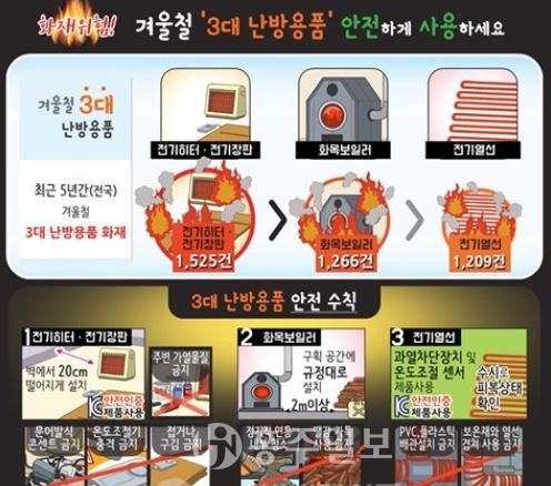 그간 3대 겨울용품으로 인한 화재원인 중 전선의 합선에 의한 화재가 가장 많이 발생하는 것으로 집계됐다. 이에 따라 △전기매트를 접거나 과하게 압박 금지 △누전차단기 정상 작동여부 확인 △문어발식 콘센트 사용자제 △전기용품의 먼지 제거 등 안전수칙을 지켜야 한다.