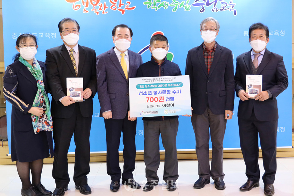 충남교육청(교육감 김지철)은 지난 10일 홍성군 청소년봉사단 청로회(대표 이철이)로부터 학생 봉사활동 사례를 모은 도서 ‘홍성 청소년들의 아름다운 섬김 이야기’ 700권을 기증받고 이를 도내 전체 중·고등학교에 배부한다.<사진>