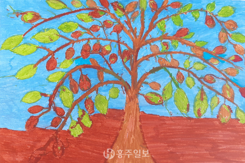 〈대추나무〉를 그리실 때는 나도 옆에 앉아 있었습니다. ‘뭐 그리세요?’ 하니 ‘조 앞 대추나무 그려요’하셨습니다. 가지 많은 대추나무를 어떻게 그리실까 궁금했는데 완성한 그림을 보니 역시 재미있었습니다. 늘어진 가지에 붉은 대추가 다닥다닥 달려있습니다. 특히 웃음이 나는 부분은 붉은 대추 사이에 아직 익지 않은 연두색 대추를 그려 넣은 것입니다. 대추의 붉은색. 푸른색의 조화는 여간 풍요롭지 않습니다. 이병수 할머니의 〈대추나무〉를 보면 그 풍성한 멋과 맛이 느껴집니다.