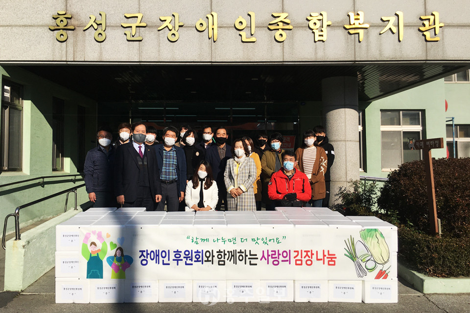 홍성군장애인후원회(회장 김미숙)는 11일 홍성군장애인복지관(관장 복천규)을 방문해 김장김치 100박스를 전달하며 사랑나눔을 실천했다. 이날 전달된 김장김치는 관내 장애인 협회 등(지체 30박스, 복지관 20박스, 시각·농아·부모회·체육회·자립장 각 10박스)에 전달될 예정이다.