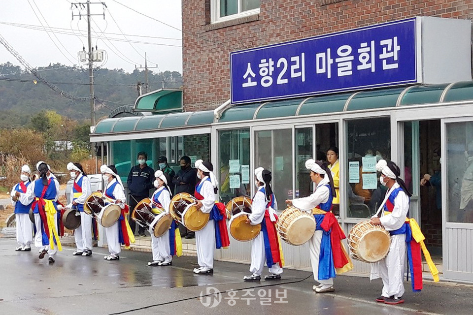 만 60세이상 밴드, 풍물, 무용, 민요 등의 재능을 보유한 20명의 회원으로 구성된 대한노인회 홍성군지회 ‘홍주소리어울림’ 행복나눔봉사단(단장 황창익)은 지난1일과 4일에 소향2리 마을회관과 오서산 입구에서 코로나19로 지친 주민들을 위로하고자 ‘찾아가는 국악한마당’ 공연을 펼쳤다.
